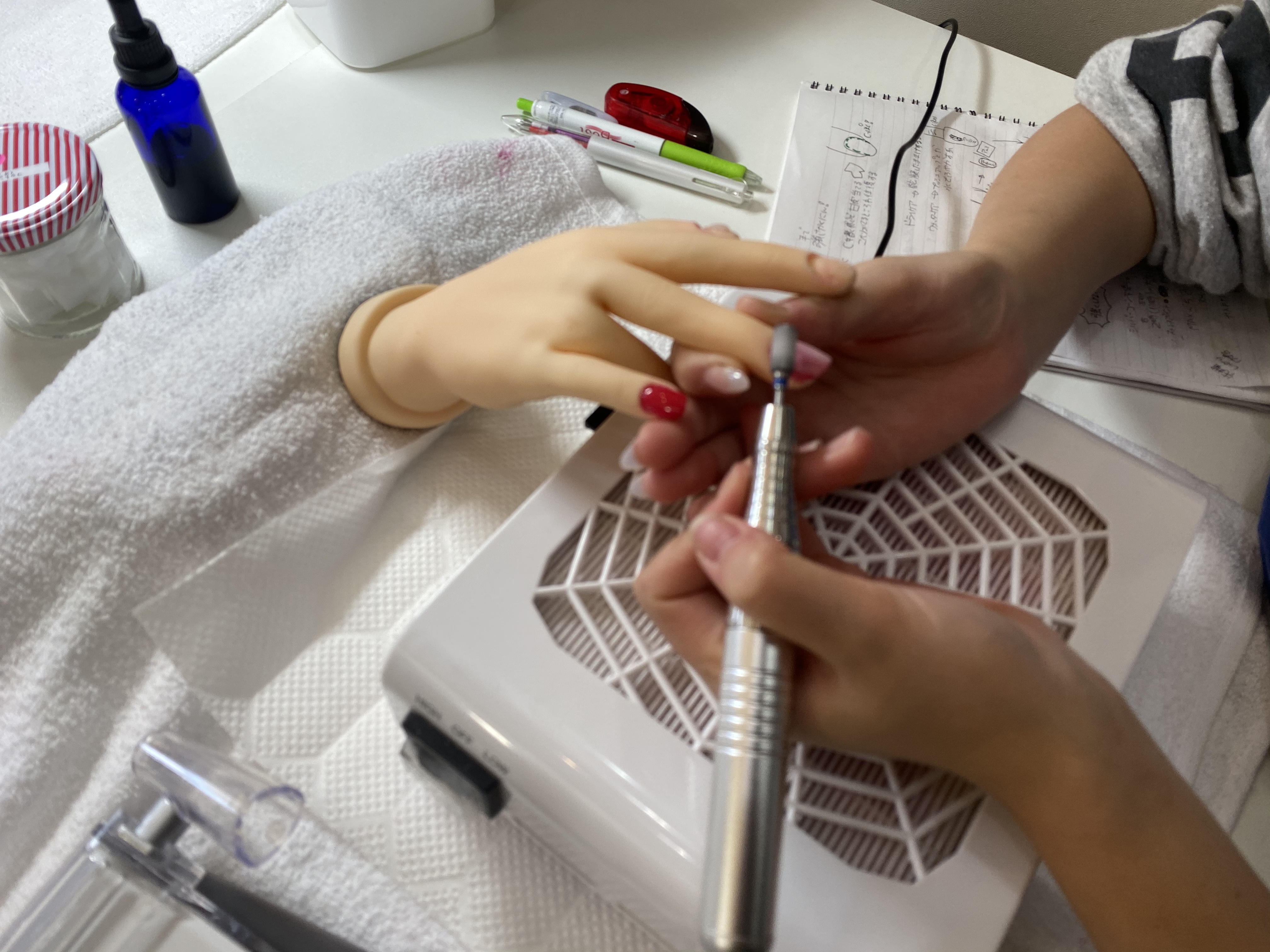 この日はNPAA認定ネイルテクニカルインストラクターのK先生からジェル基礎を学んだあと実際にハンド君で反復練習をします!
