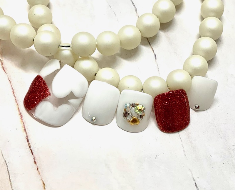②シアーレッド✖♡ホロ フットコースにお揃いのデザインございます。バレンタインにぴったり。