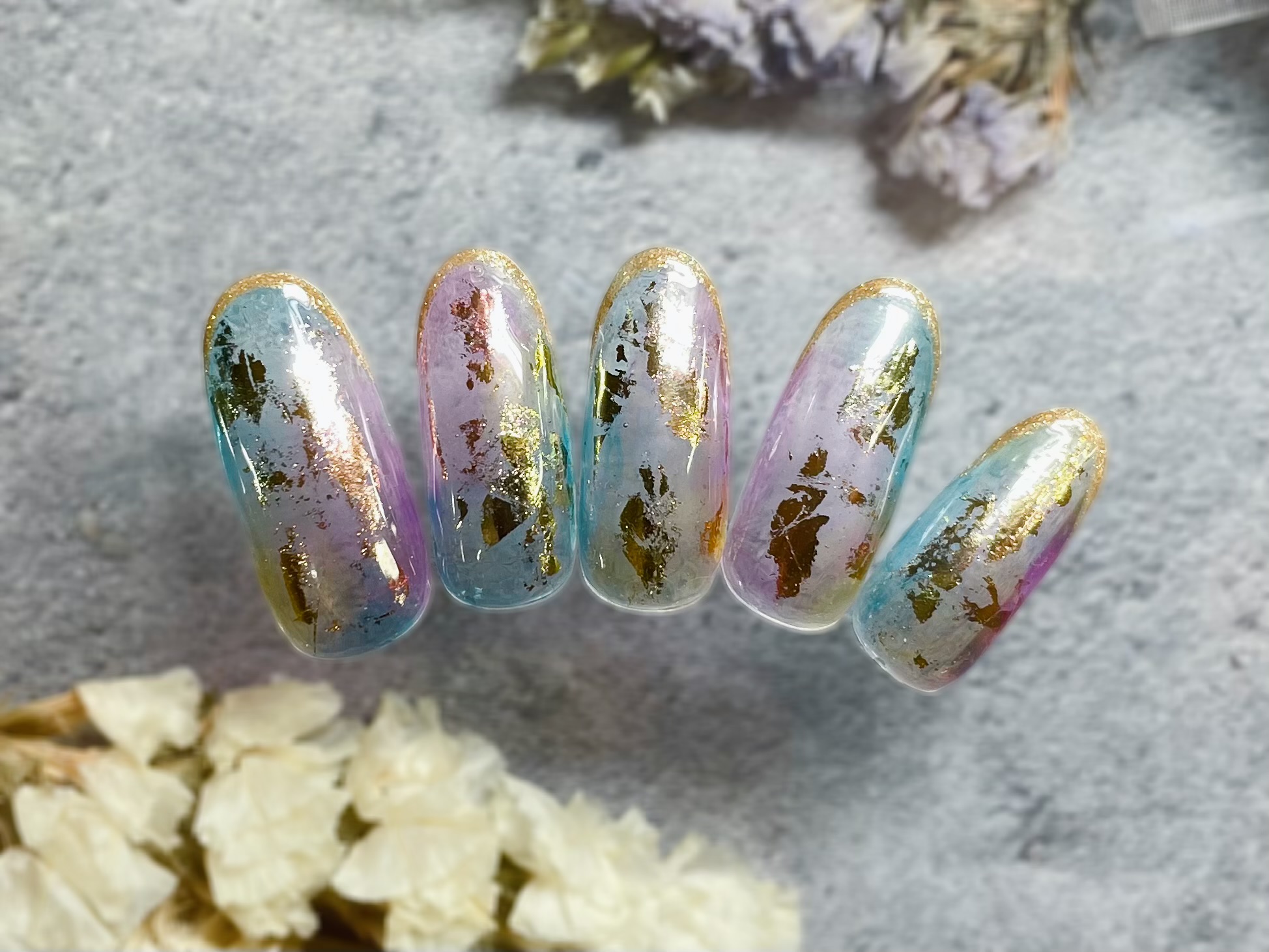 夏っぽいシェルにゴールドミラーフレンチが映える大人っぽいデザインです!どの指もキラキラと輝いていて見てて飽きません(^^)♪