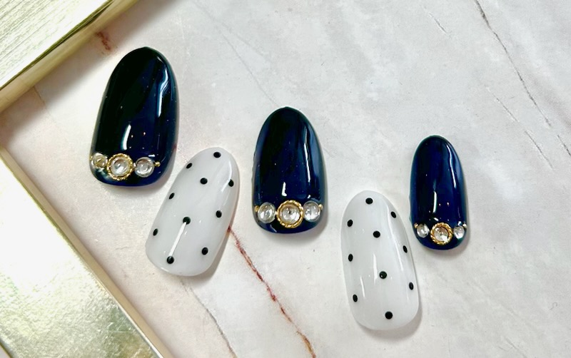 ネイビー×ホワイト。ドットとキラキラストーンが