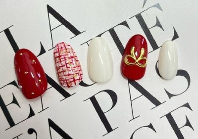 人差し指のツイード柄と薬指のリボンパーツがポイントになった
