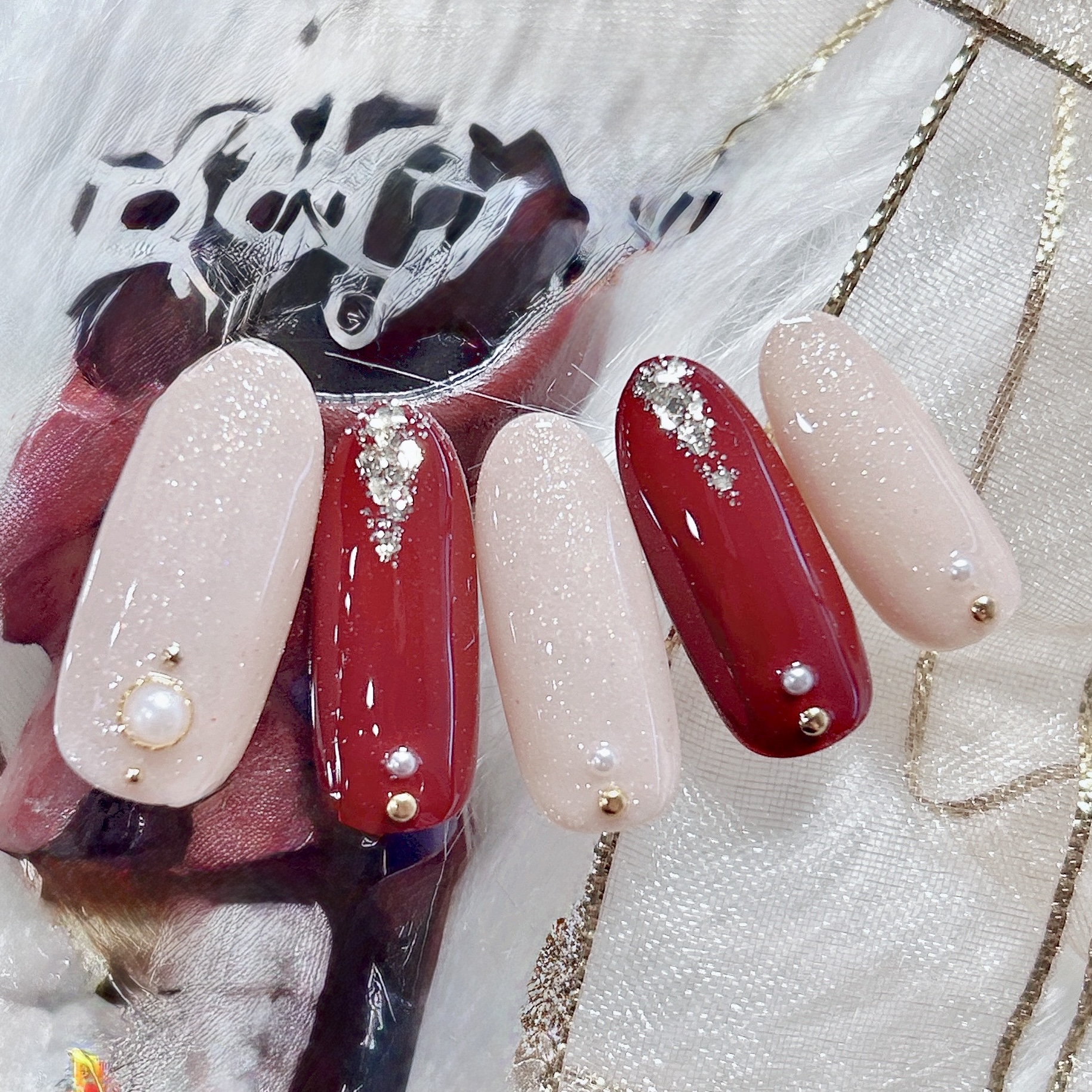 ラメ入りカラーとボルドーの組み合わせ◎