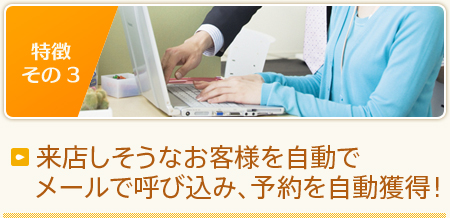 自動的にメールで顧客フォローをしてくれるので、電話で営業する手間や、DMを発行するコスト負担や宛名書きの業務負担を軽減してくれる結果、サロンスタッフは仕事に集中してくれます。【coming soon】は、仕事が効率的になり、売上アップを目指す事が可能になる一石二鳥な便利な予約管理システムです。