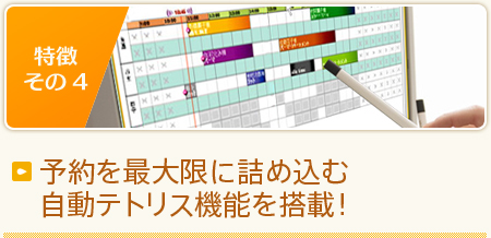 受付スタッフの裁量による予約のバラつきを解消!他の「予約管理」システムは一見予約が埋まっていそうでも、実は並べ替えをするとまだ予約が取れる状態になることがよくあります。カミングスーンでは混雑具合が一目で分かる管理画面の採用により、予約の調整が容易に行えます。